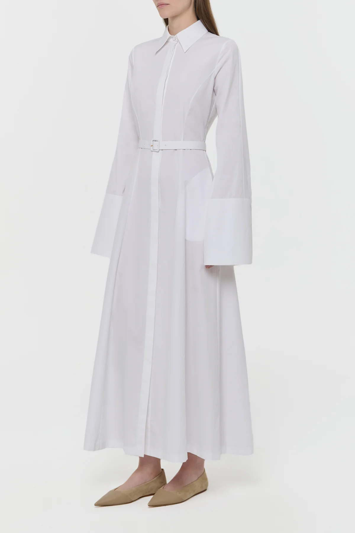 The Carmina Shirtdress features full length button up detailing to the point collar, belted at the waist and finished with elongated wrist cuffs that elevate this timeless silhouette in 100% sea island cotton poplin from barbados.
