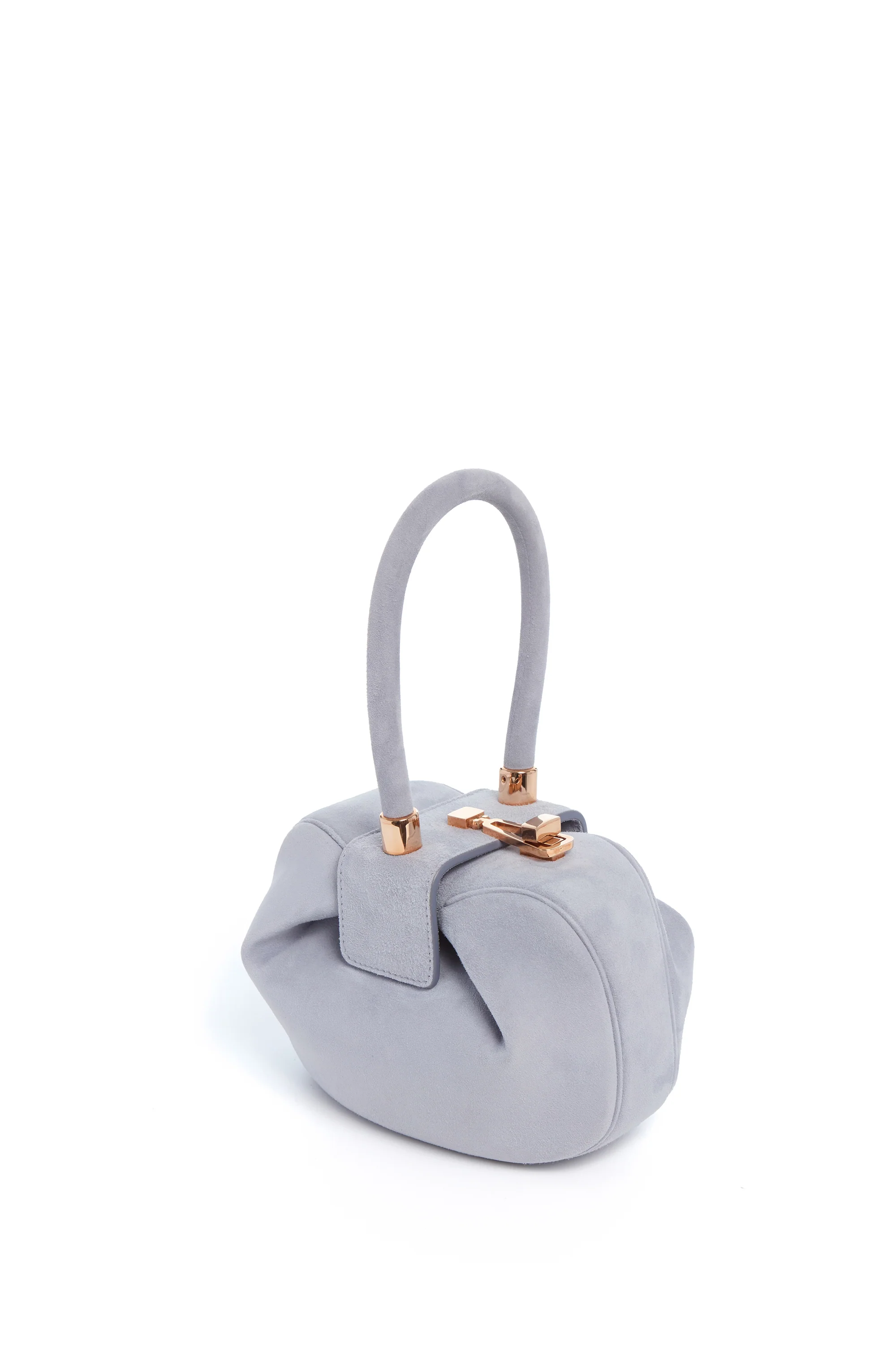 The Demi Bag is the smaller version of the Nina Bag. A structured top handle with a distinctive round pouch that gently unfolds from a turnlock closure, the Demi is crafted from smooth Italian Suede.