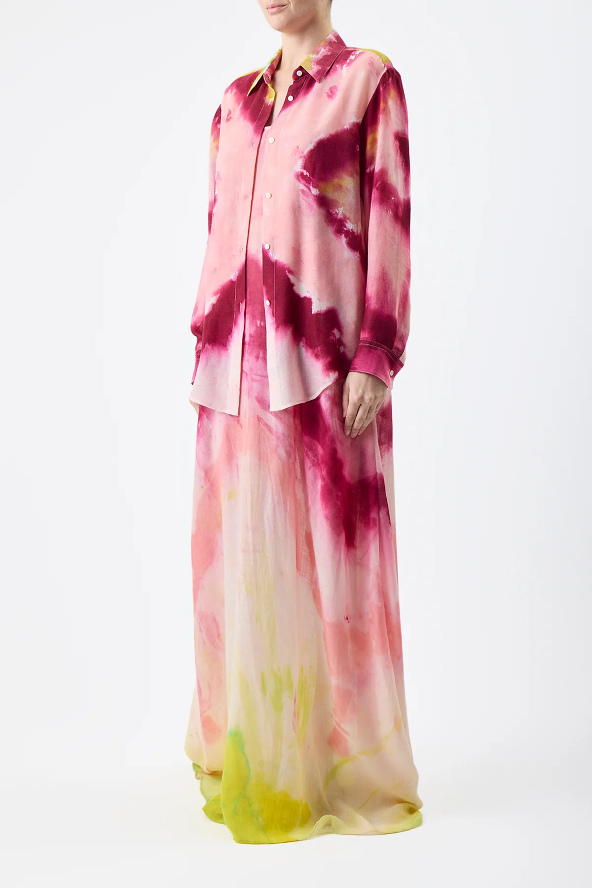 The Ferrara Shirt is a button-down which utilizes classic menswear details, contrasted unexpectedly in a soft cashmere gauze, emblazoned with a vibrant, tie-dyed hand-placed layout. Each piece unique.