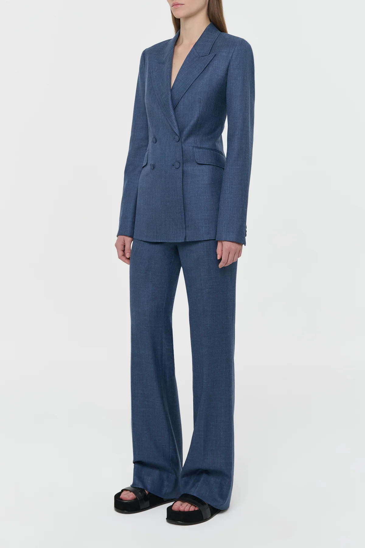The Vesta Pant is crafted from Italian wool and inspired by traditional men's tailoring yet cut with a distinctly feminine fit. Gabriela Hearst's signature suit silhouette is made up of a sharply tailored double-breasted jacket with a defined waist paired with gently flared trousers.