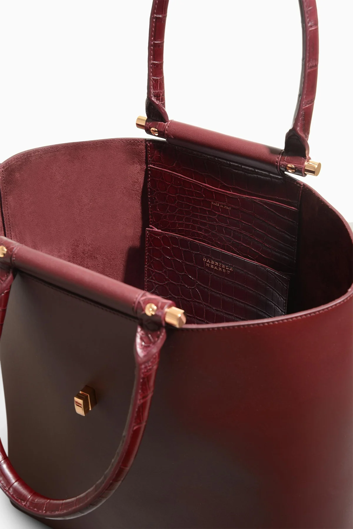 - Calfskin exterior and interior with crocodile leather handle